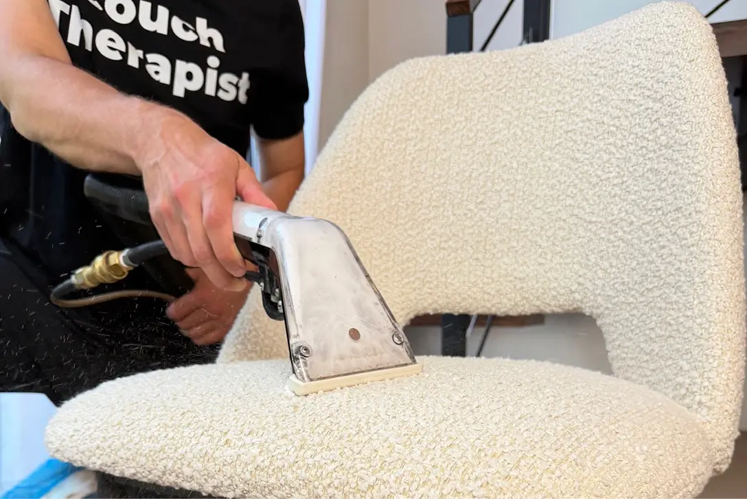 Along with hot water extraction, we run a special rinse through the machine that helps neutralize residue and leaves the fibers feeling soft, not crunchy. This step supports fiber hygiene by reducing bacteria and dust mites that collect where people sit every day — especially important for dining chairs and home office chairs you use for hours.